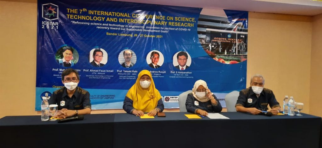 Fakultas Teknik Universitas Lampung menggelar International Conference on Science, Technology, and Interdisciplinary Research (ICSTAR) 2021 dengan tema “REFOCUSING SCIENCE AND TECHNOLOGY IN ENGINEERING INNOVATION FOR RESILIENT OF COVID-19 RECOVERY TOWARD OUR SUSTAINABLE DEVELOPMENT GOALS”. Ketua Panitia, Prof. Drs. Sugiyanto, M.T., menyampaikan bahwa konferensi internasional ICSTAR 2021 diadakan secara daring melalui videconference dan tatap muka di Hotel Golden Tulip Kota Bandar Lampung.